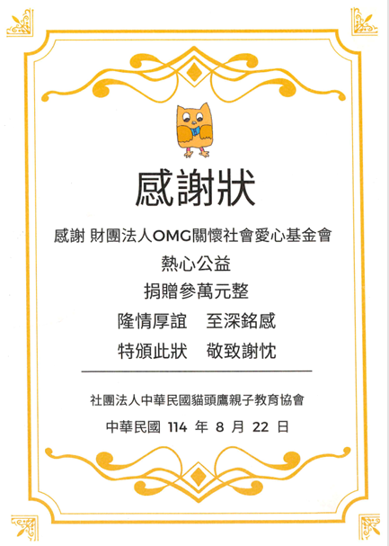 - ◎捐助 社團法人中華民國貓頭鷹親子教育協會$30,000元。