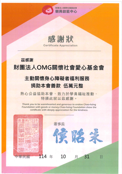 - ◎捐助朝興福利慈善事業基金會高齡憨兒醫療費用$50,000元。
