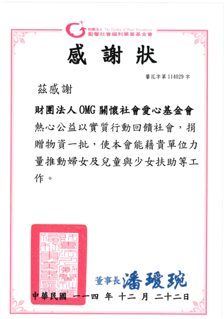 OMG關懷社會愛心基金會多年來積極投入社會公益,以下是部份單位對本公司的感謝狀: